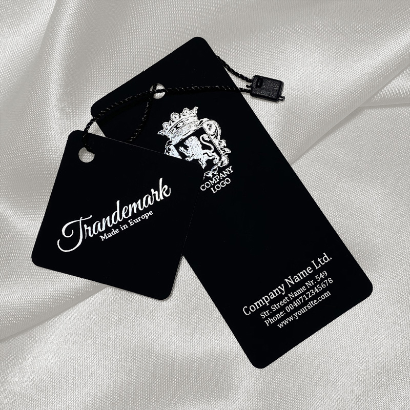 Sæt bestående af 2 smukke pap etiketter hvor der medfølger forseglingsmærke med snor til tøjet, lavet af sort blødt touch lamineret pap og personaliseret med sølv folio digitalt varm pres type. Denne type af hænge etiketter er lavet af gode kvalitetsmaterialer, ved brug af de mest avanceret teknologier i feltet af digital print og færdiggørelse.