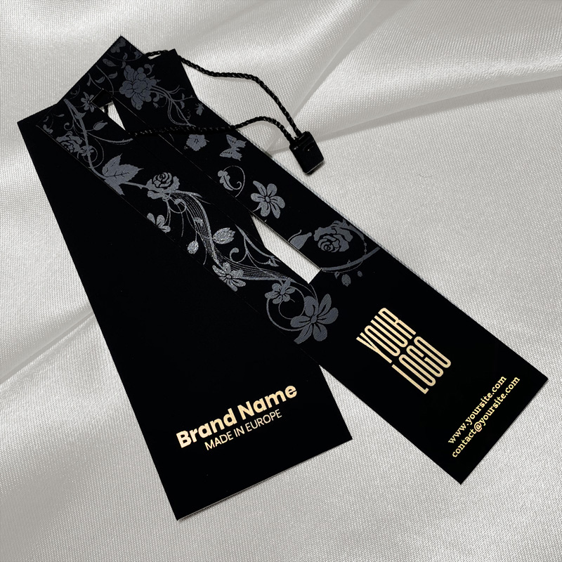 Elegant sæt af pap hænge etiketter med et sort plastik forseglingsmærke lavet af høj kvalitetsmaterialer til forskellige slags tekstiler så som kvindetøj, kjoler, mandetøj, bukser, jakker, osv. Denne type af hænge etiketter er lavet af gode kvalitetsmaterialer, ved brug af de mest avanceret teknologier i feltet af digital print og færdiggørelse.