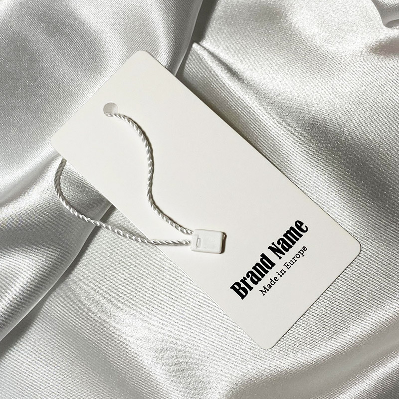 Brugerdefineret karton ettiketer med snor, der er egnet til tøj, fodtøj, smykker og forskellige beklædningsgenstande, trykt med mærke og logo. Denne type af hænge etiketter er lavet af gode kvalitetsmaterialer, ved brug af de mest avanceret teknologier i feltet af digital print og færdiggørelse.