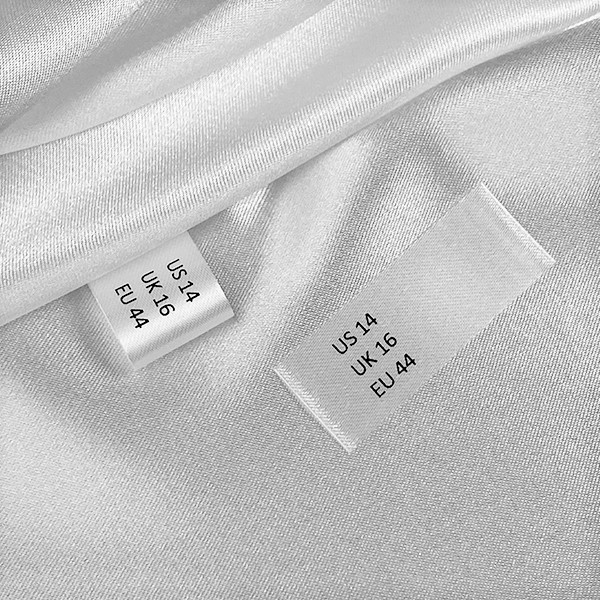 Størrelsesmærke af satinrulle, der er trykt og skåret til de ønskede mål, til syning på tøj eller beklædningstilbehør. Denne type af tekstile etiketter er lavet ved brug af de mest avanceret teknologier i det digitale printeområde inden for tekstil support. Etiketterne er printet på specielt satin af en termisk overførselsmetode, med en imponerende print kvalitet og høj vaske mostand.