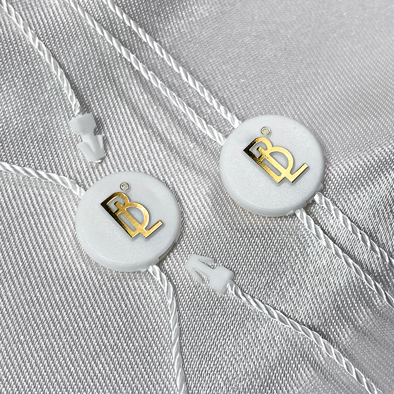 Plastik forseglingsmærke ST-M34 med en rund form, meget elegant og smukt, brugerdefineret på to sider med brandets navn eller emblem, egnet til tøj, sko, tasker, osv. Denne type af forseglingsmærke er lavet af materialer i høj kvalitet ved brug af de mest avanceret teknologier i feltet.