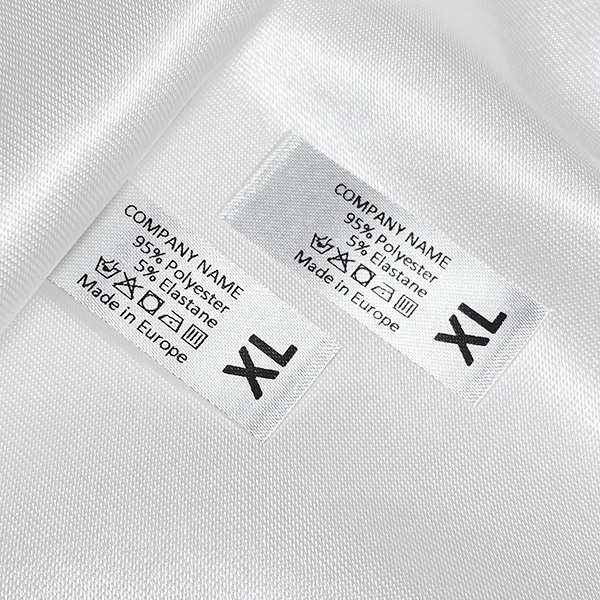 Tøj Vaskemærke med størrelser og vaskesymboler lavet af højkvalitets satin, at blive syet på tøj. Denne type af tekstile etiketter er lavet ved brug af de mest avanceret teknologier i det digitale printeområde inden for tekstil support. Etiketterne er printet på specielt satin af en termisk overførselsmetode, med en imponerende print kvalitet og høj vaske mostand.