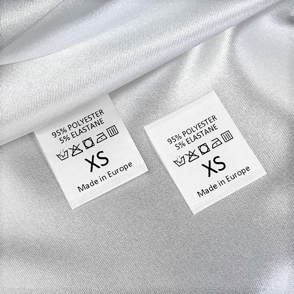 Vaskeplejeetiket trykt på hvidt satin med vaskesymboler, materialesammensætning og størrelsesangivelse, med ultralydsskårne kanter. Denne type af tekstile etiketter er lavet ved brug af de mest avanceret teknologier i det digitale printeområde inden for tekstil support. Etiketterne er printet på specielt satin af en termisk overførselsmetode, med en imponerende print kvalitet og høj vaske mostand.